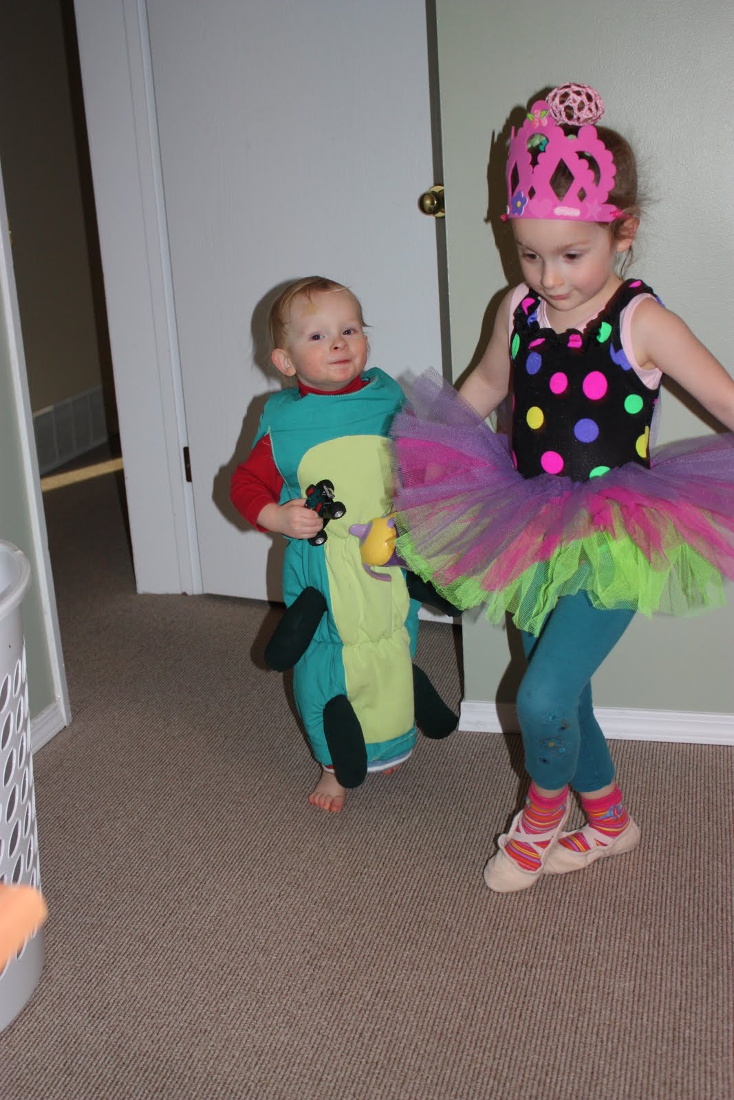 Peekaboo got herself all dressed up and was doing a "Ballerina Show" for me, complete with music (hummed by...Peekaboo!) Ezra caught wind that something neat was going down, and crashed the dance recital-wearing his old Halloween costume, the Caterpillar!! He came charging into the room, complete with his own soundtrack, car engine noises!!